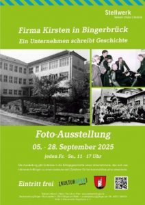 Geschichtliche Entwicklung und Foto-Ausstellung zur Fa. Kirsten in Bingerbrück, vom 05.-28.09. im Stellwerk BOT im Park am Mäuseturm. Die Ausstellung gibt Einblicke in die Erfolgsgeschichte eines Unternehmens, das sich aus kleinsten Anfängen zu einem bedeutenden Zulieferer für die Automobilindustrie entwickelte. Die Ausstellung ist Fr–So. von 11 – 17 Uhr geöffnet.